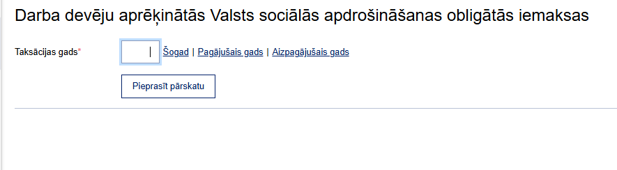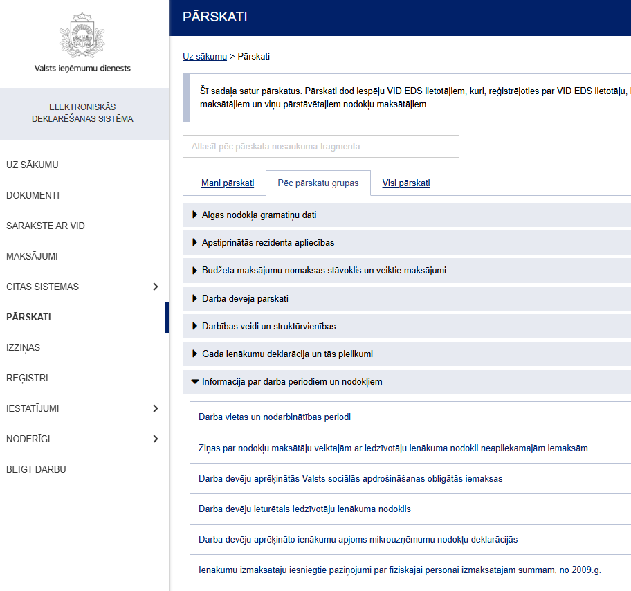 После авторизации, в левой стороне окна находим раздел Pārskati. Выбираем вкладку отбора по группам Pēc pārskatu grupas. Находим раздел Informācija par darba periodiem un nodokļiem.