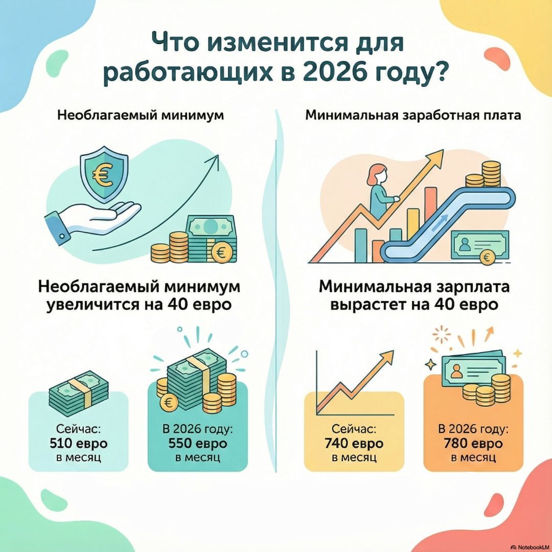 В 2025 году сумма необлагаемого минимума составляет 510 евро в месяц, а в 2026 году планируется увиличить до 550 евро в месяц.